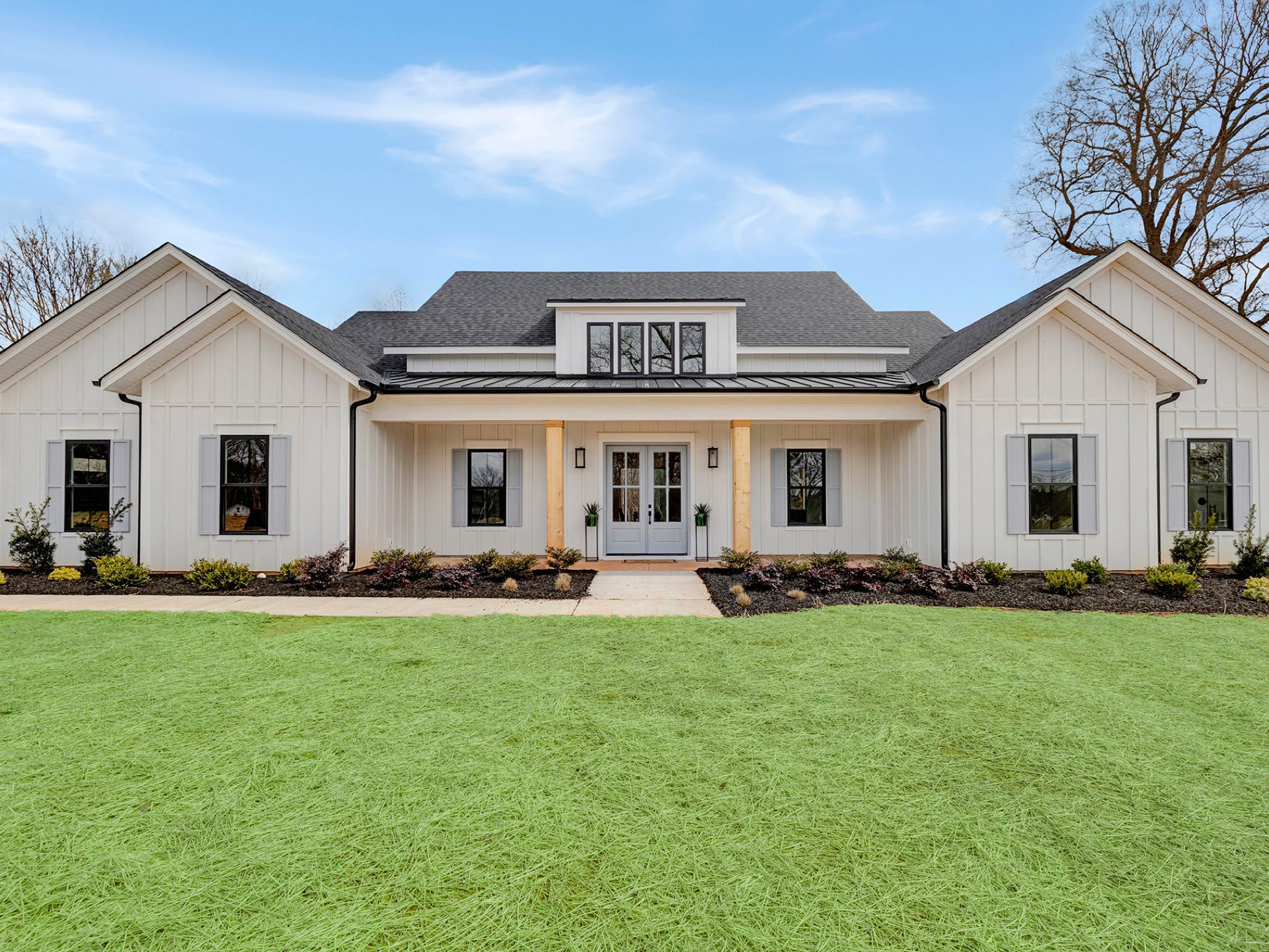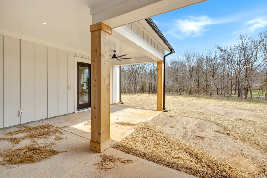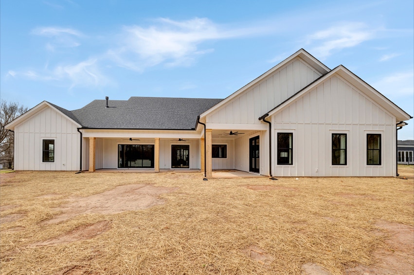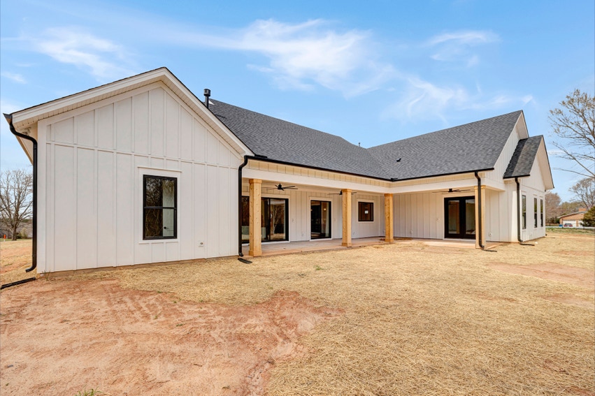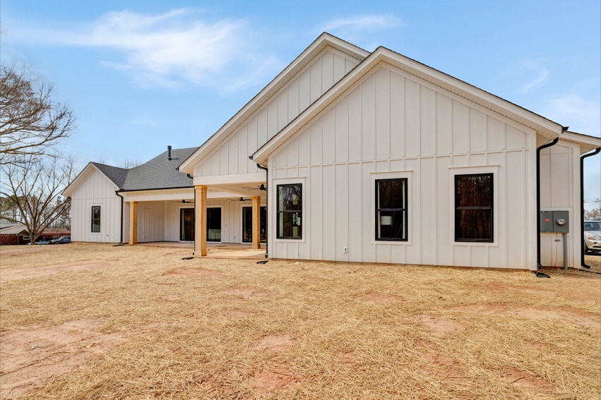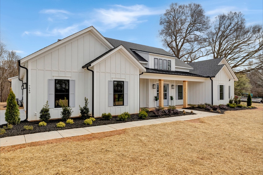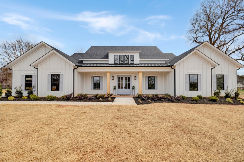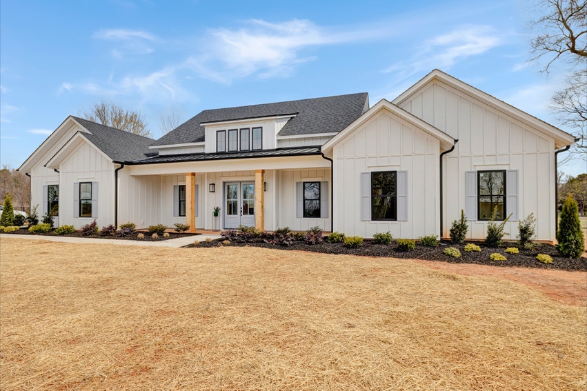Charming Farmhouse ranch home. The open design boasts 12' & 13' ceilings in the living & dining areas. A large rear covered porch is prewired for TV, and, pre-plumbed for an outdoor kitchen. This home features many nice details & special touches, top-level quartz countertops, luxury LVP flooring throughout, walk-ing pantry, office and laundry room off the primary closet.
